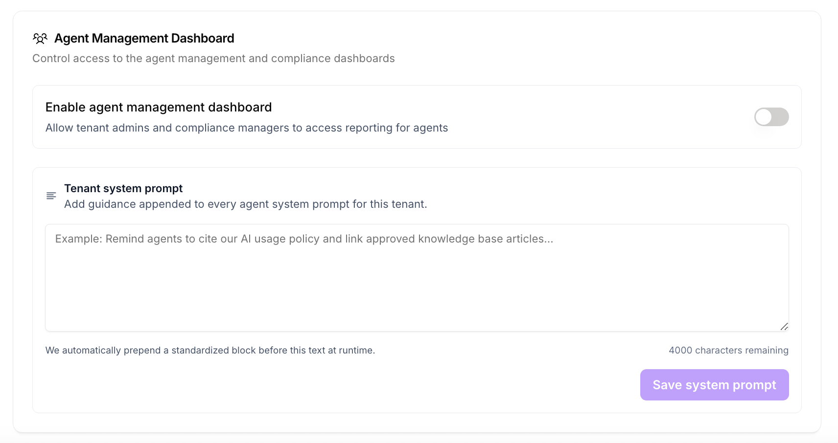 - System Prompt Control: Configure system-wide instructions for all agents