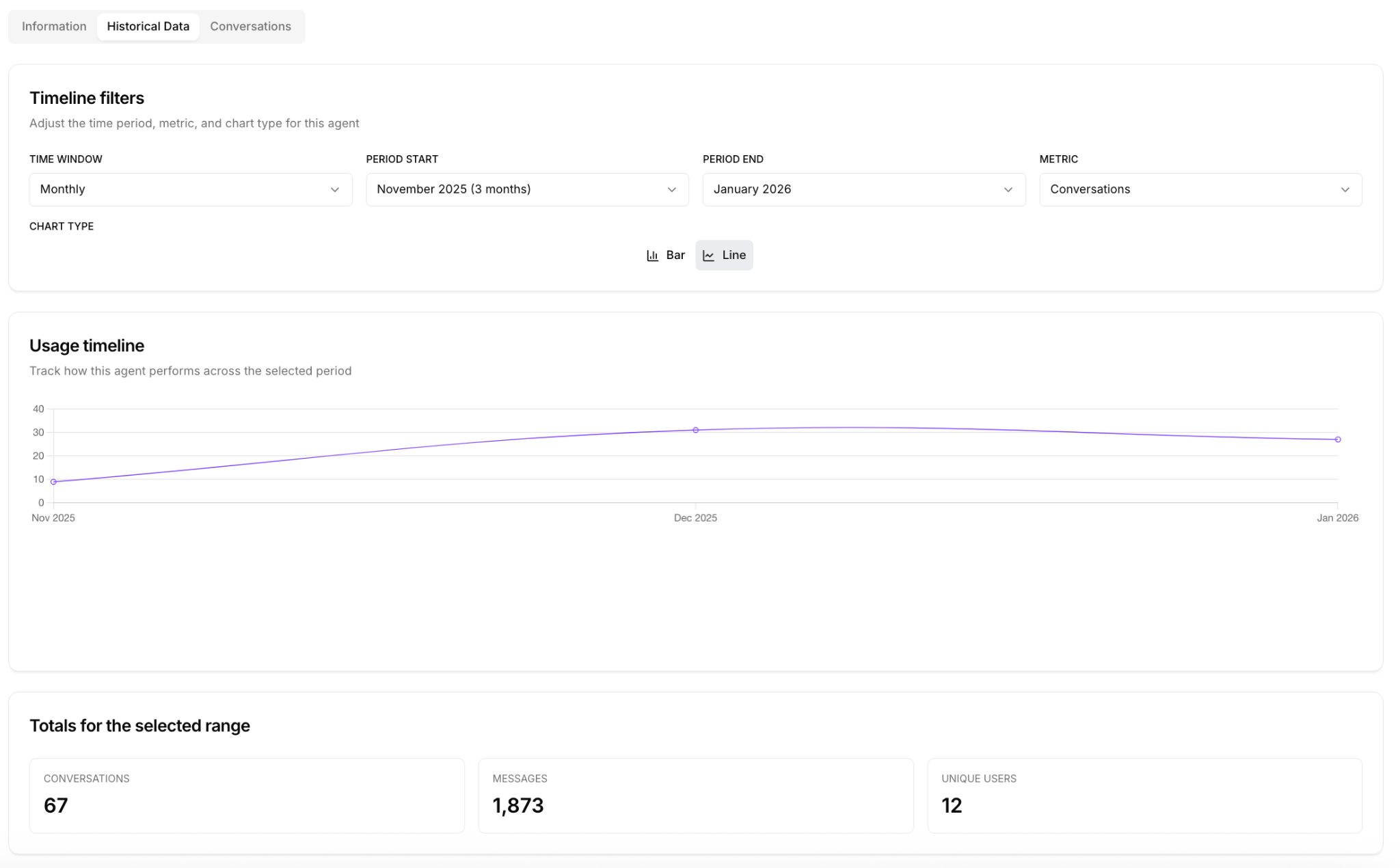 - User Engagement: Number of unique users interacting with each agent