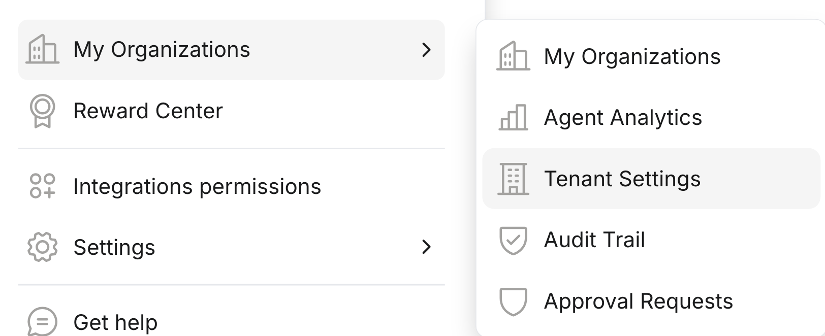 When hovering over the My Organizations tab, tenant admins will see the following options: