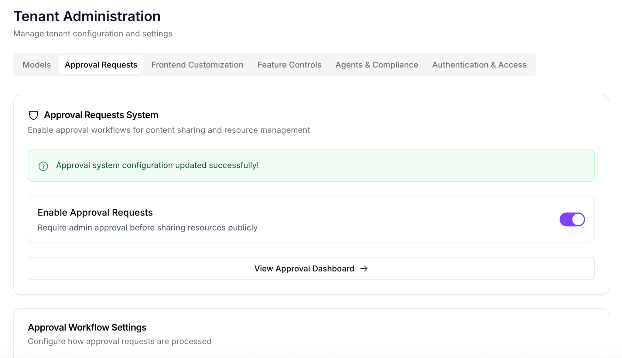 - Approval System Toggle: When enabled, users must request admin approval before sharing any resources