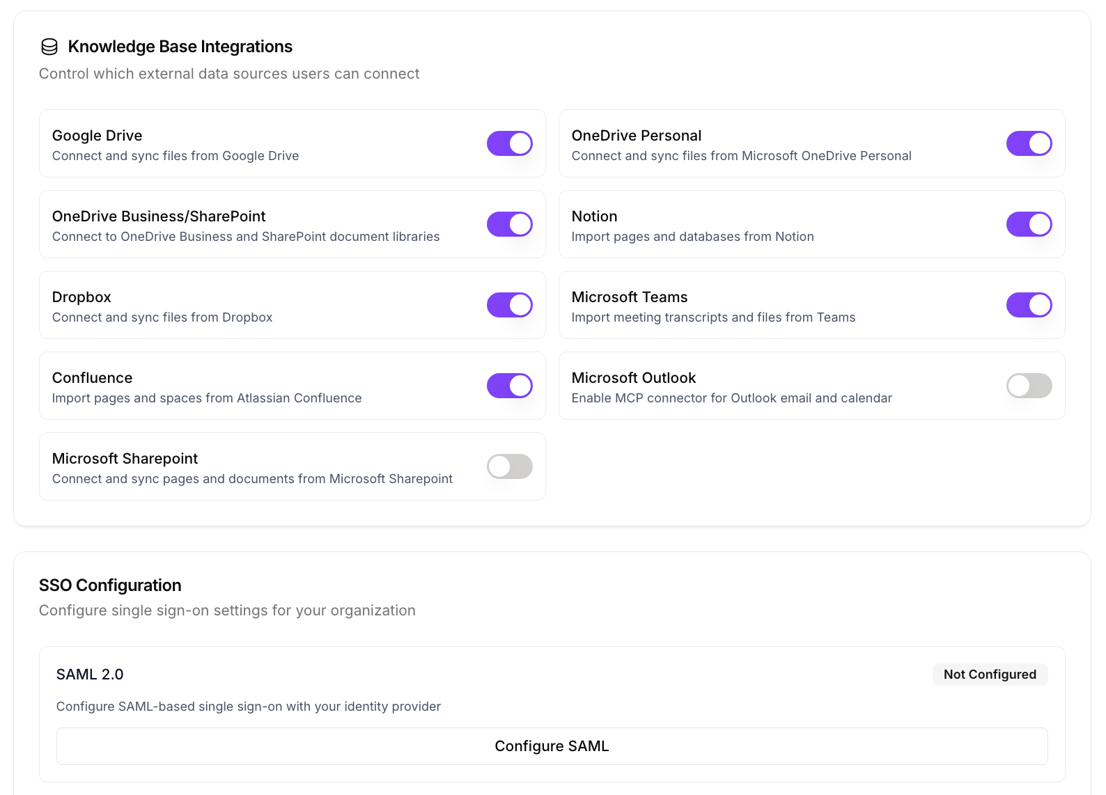 Configure authentication methods, SSO, and knowledge base integrations for your organization.